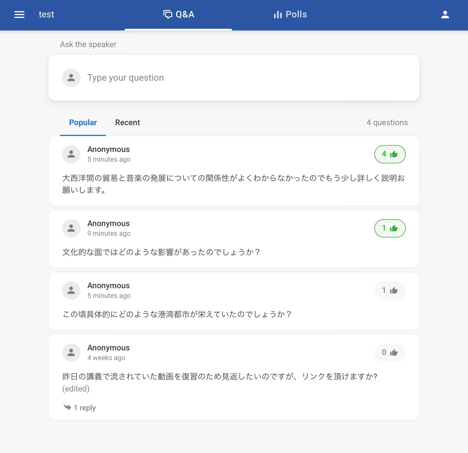 • 投票機能などもあり,質問以外のコミュニケーションをとることもできる.