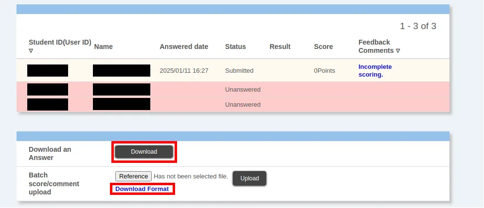 4. If the file is uploaded successfully, the scores and feedback comments in the Excel file for scoring will be loaded, and the status column for the scored students in the “Answer Status” screen will change to “Marked” or “Entered by the instructor”.