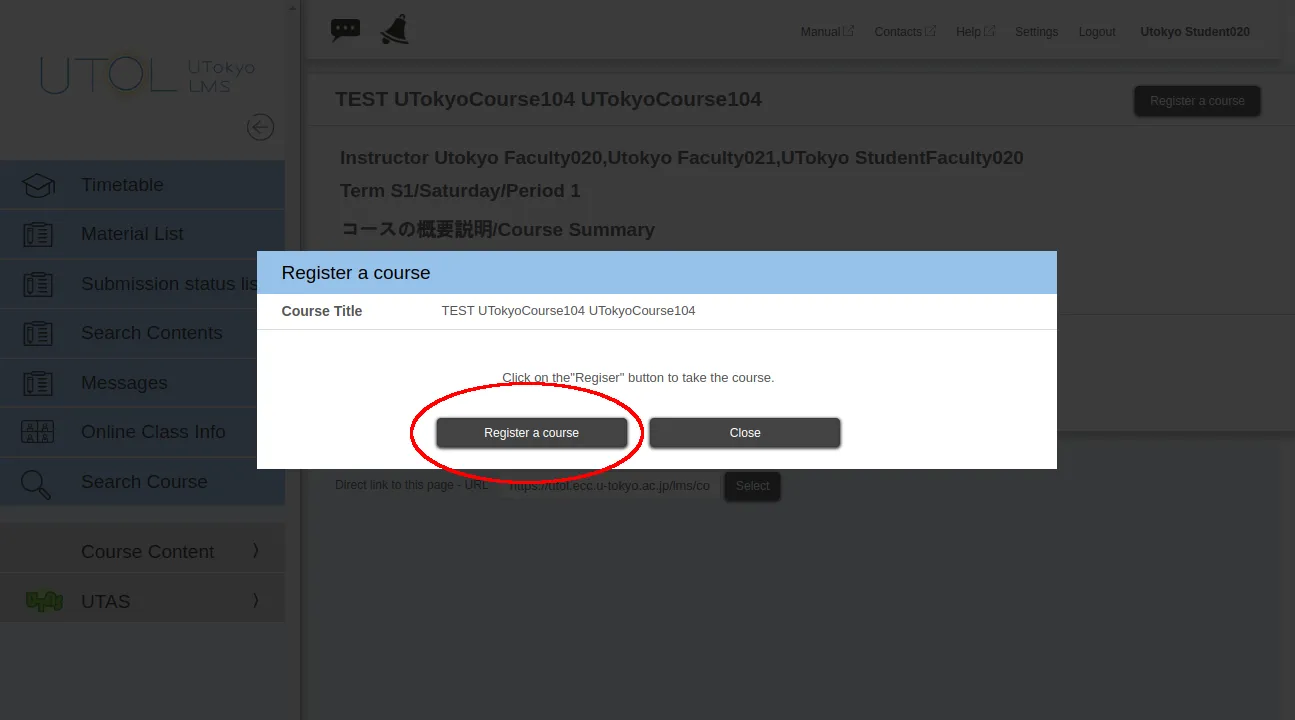 - This is a “self-registration” that can be made by clicking the button “Register a course” on UTOL. (This registration may be deleted after the enrollment registration period.)