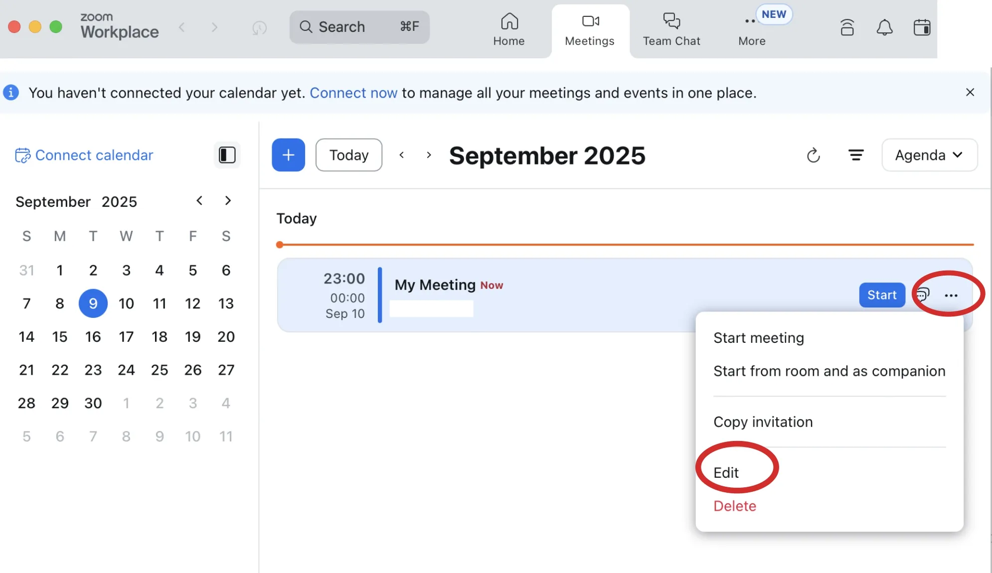 These operations can be performed not only from the browser but also from the app. Select the Meetings tab, click the …icon for the relevant meeting, and then select Edit.