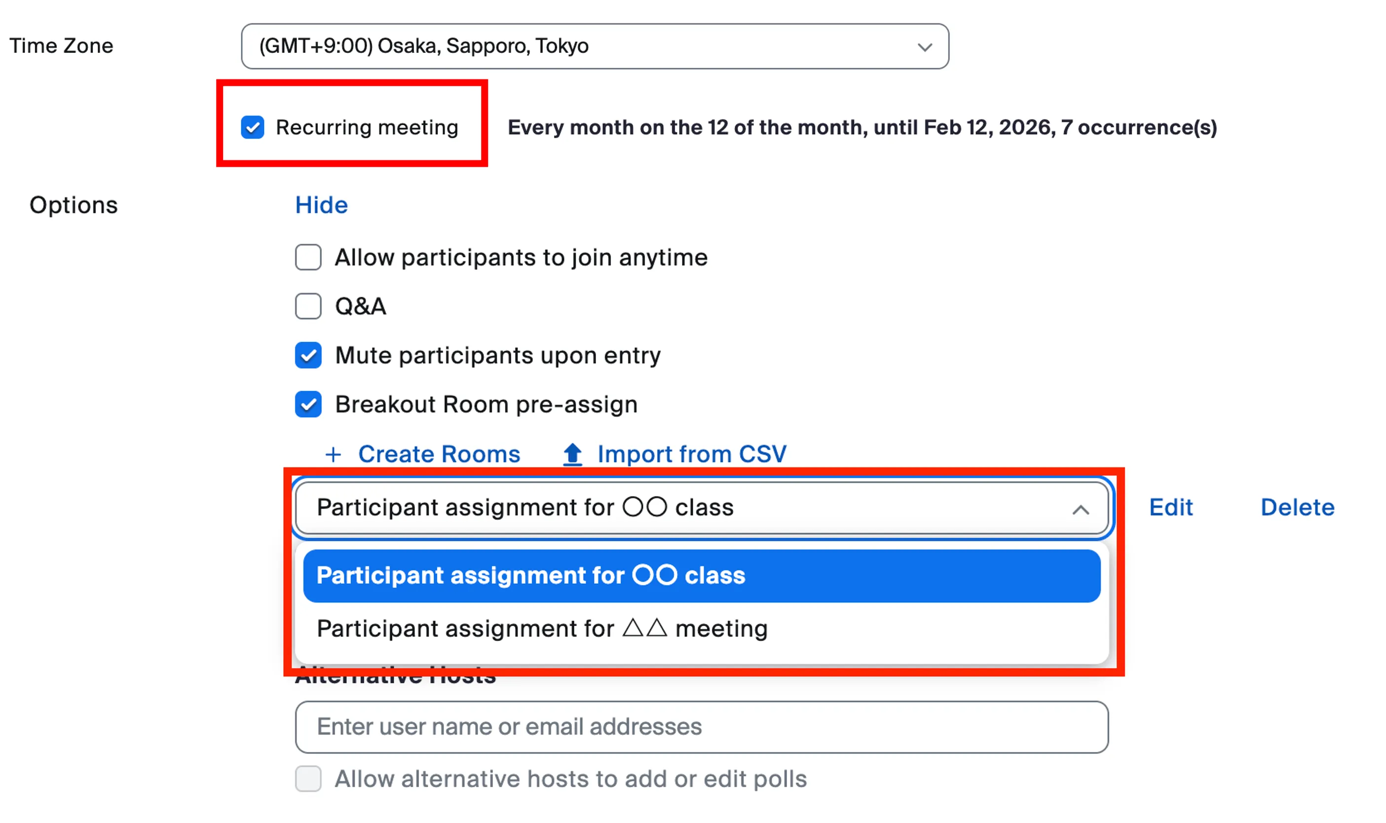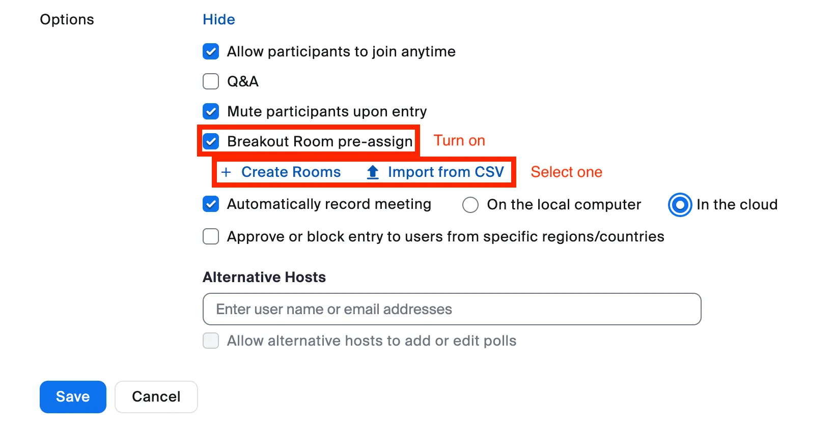 For recurring meetings, in addition to “Create Rooms” and “Import from CSV”, you can also pre-assign participants to breakout rooms using an assignment saved from a previous meeting. This method is explained later in “Save Participant Assignments”