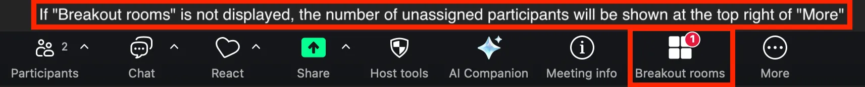 If participants join the main meeting late, their number is displayed in red text at the top right of the “Breakout rooms” button at the bottom of the meeting screen (if the button isn’t visible, click on “More” to display it). During a breakout session, be careful to check if latecomers remain unassigned.