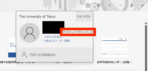 - 上記のような画面が表示されず,通常の編集画面が表示された場合:OfficeアプリになんらかのMicrosoftアカウントでサインインしている状態です.Windowsの場合は右上の人型のアイコンを、macOSの場合は左上の円形のアイコンをクリックした後,現在サインインしているアカウントを確認してください.UTokyo Accountでない別のアカウントでサインインしていた場合は「アカウントを追加する」を選択してください.