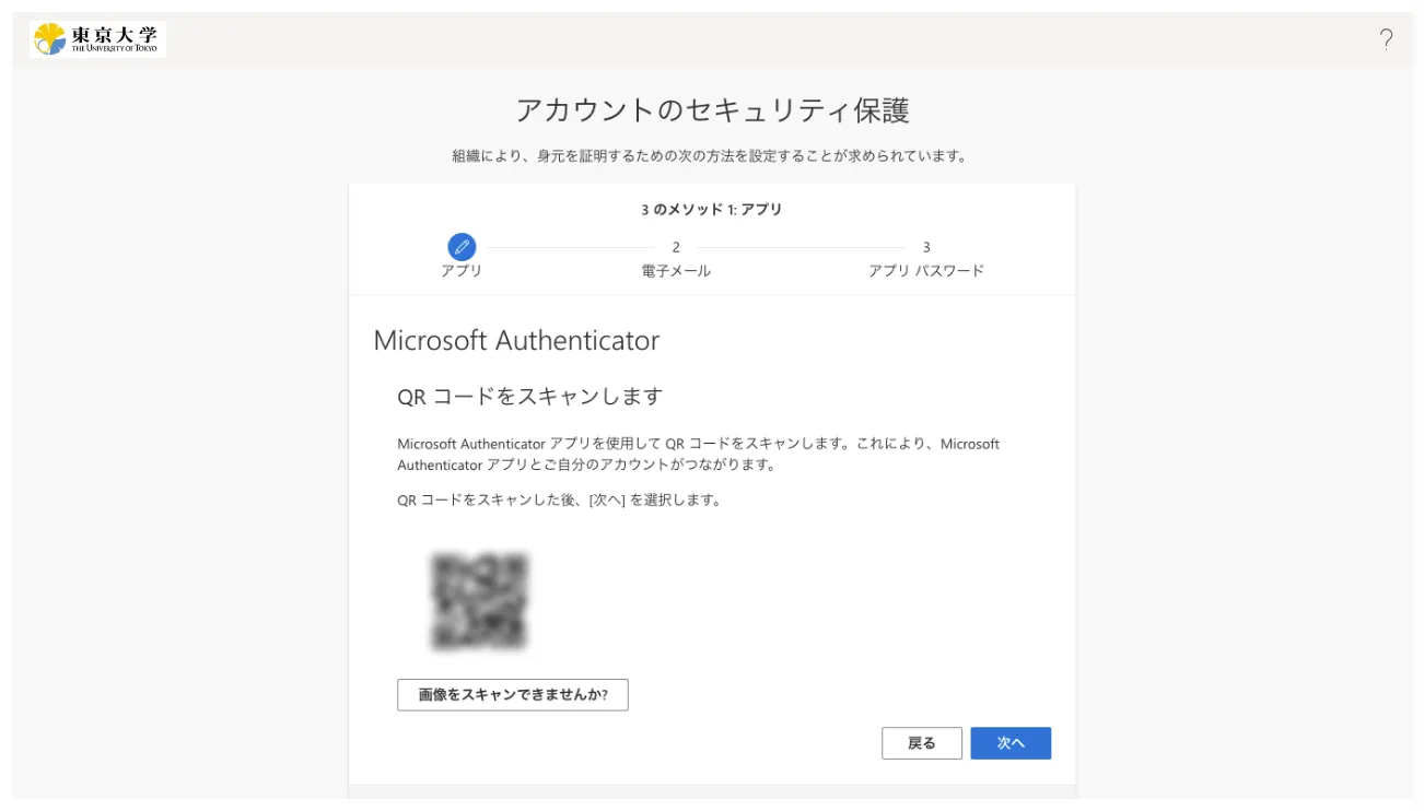 Microsoft Authenticatorの設定をする画面が表示されるので,そのまま「次へ」を押してください.