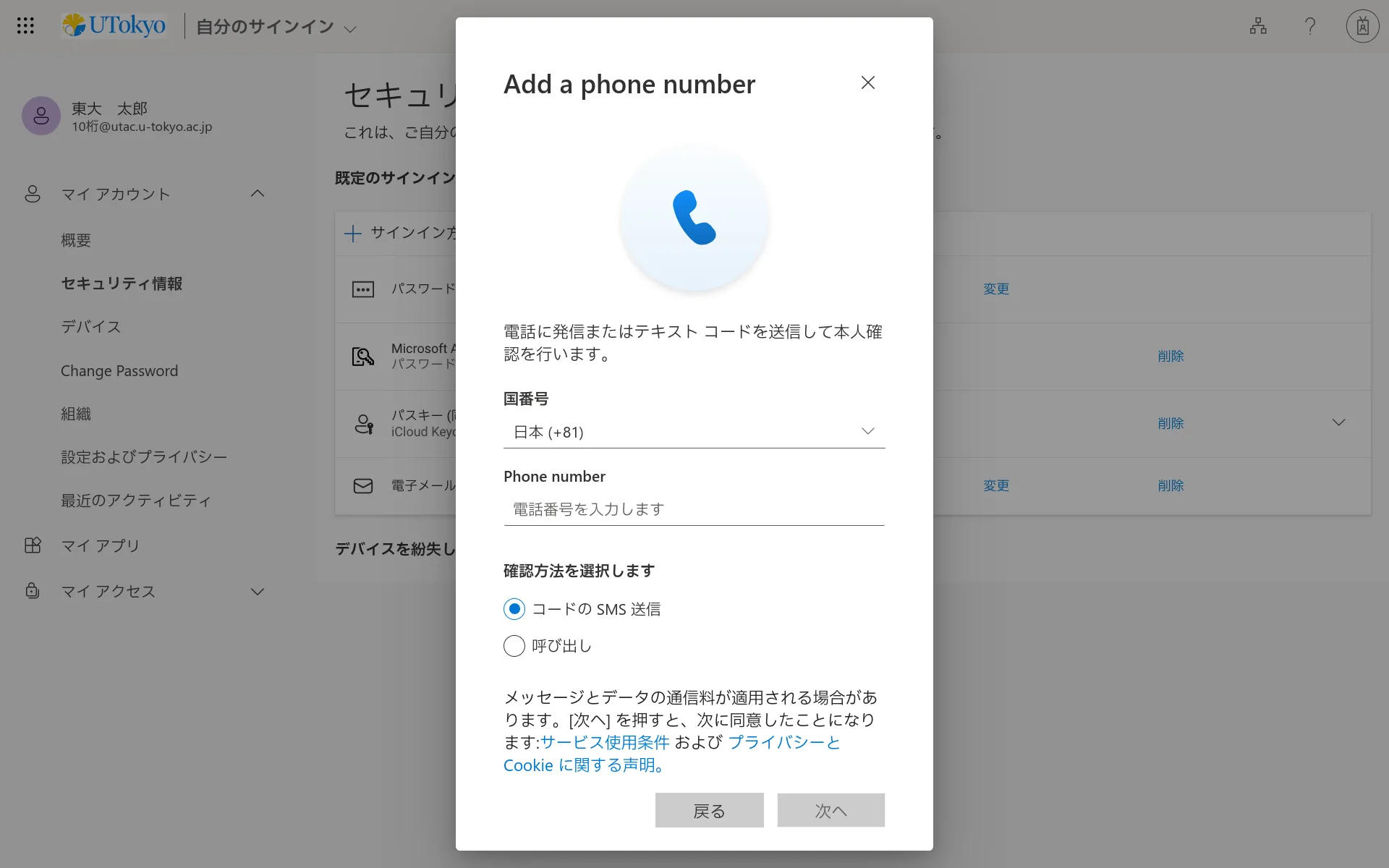 手順を終えると,その後UTokyo Accountにサインインする際,毎回,設定したSMSや専用のアプリなどで本人確認することが求められます.登録した本人確認方法(スマホのアプリや電話番号)が利用できない状態ではUTokyo Accountにサインインすることができなくなりますので,十分ご注意ください.