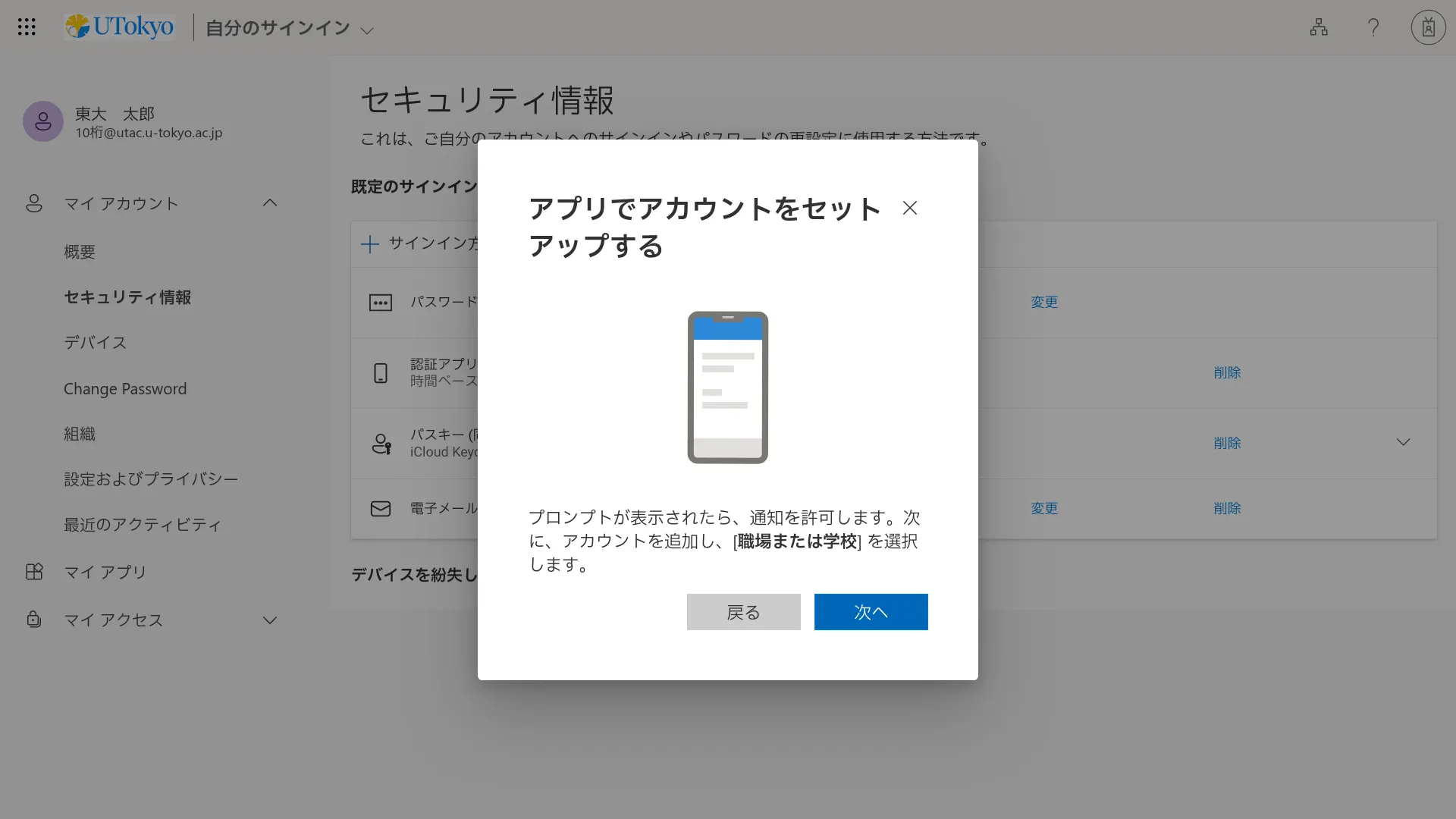 @utac.u-tokyo.ac.jp)とパスワードを入力してください. - 「詳細情報が必要」という画面が表示されるので,「次へ」を押してください.