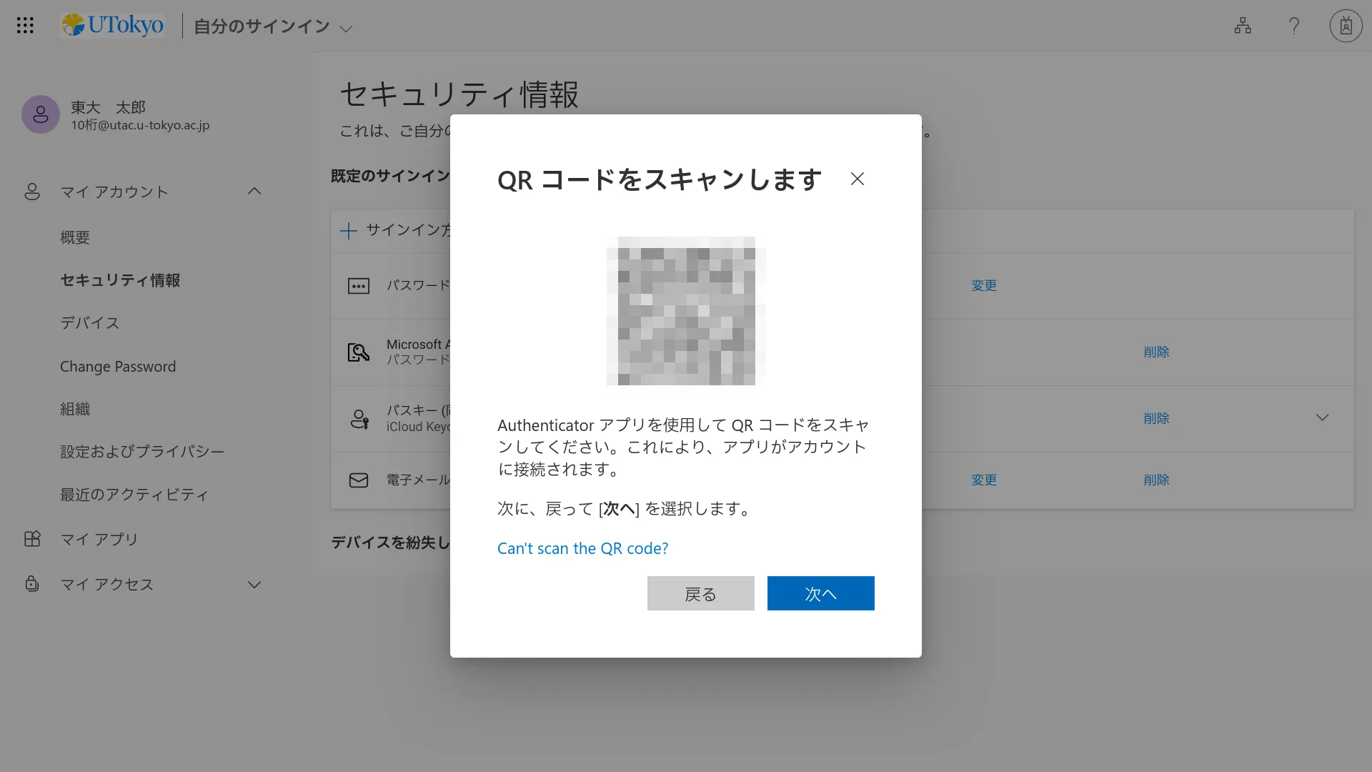 - 読み取りに成功し,アプリ上に自分のUTokyo Accountが表示されればOKです.QRコードの表示された画面に戻って「次へ」を押してください.