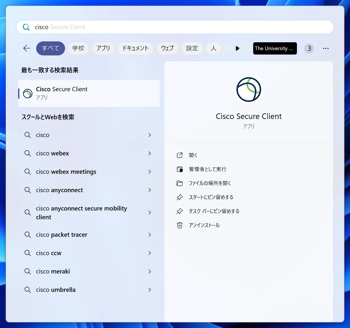 手順A・手順Bにおいて使用するブラウザを,Google ChromeまたはMicrosoft Edgeに変更することで,問題が解消する可能性があります.手順D: インストールが完了すると,アプリにVPNクライアントアプリケーションであるCisco Secure Clientが追加されています.