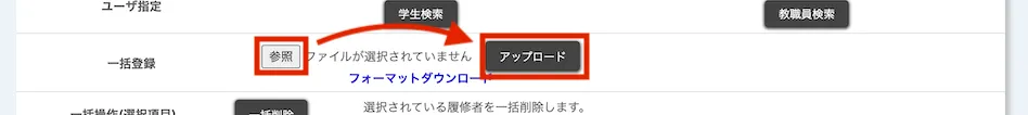 - 「一括登録」の「参照」からファイルを選択し,「アップロード」してください.
