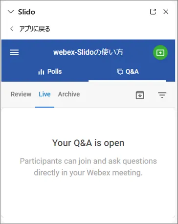 • Webex上で作成したSlidoイベントは,主催者のSlidoイベント一覧のページに保存されます.