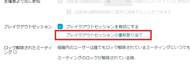 • ミーティングの作成時に「ブレイクアウトセッションの事前割当て」をクリックすると,招待した参加者を各ブレイクアウトセッションに割り当てることができます.CSVで割り当てを読み込むこともできます.