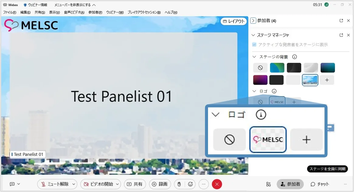 ※停止した場合,出席者はステージマネージャーで設定した背景などは利用することはできません.再度「同期」するとステージマネージャーで設定したレイアウトを使用できます.