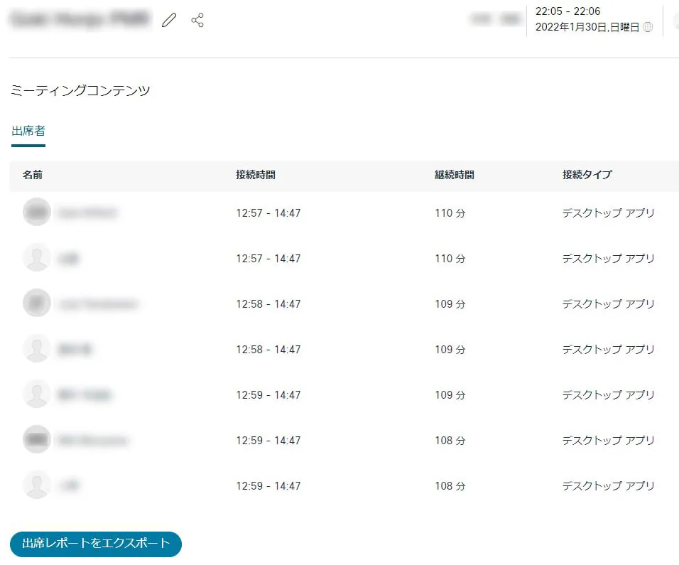 3. 出席者が表示されます.必要に応じて「出席レポートをエクスポート」します.