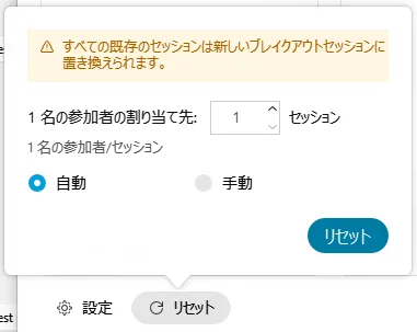 • 「リセット」をクリックすると,ブレイクアウトの個数の設定からやり直すことができます.手でやった割り当てはすべて上書きされます.