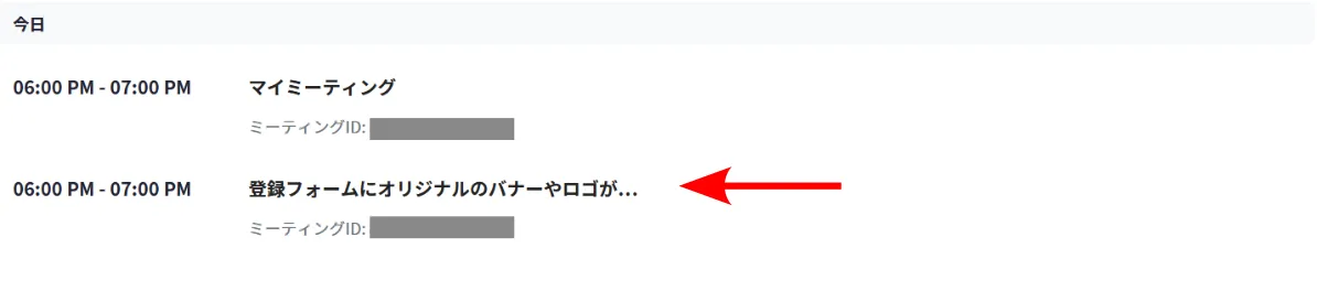 - 自分のスケジュールしたミーティングが,リストとして表示されます.バナーやロゴを登録用ページに追加したいミーティングの名前を押してください.