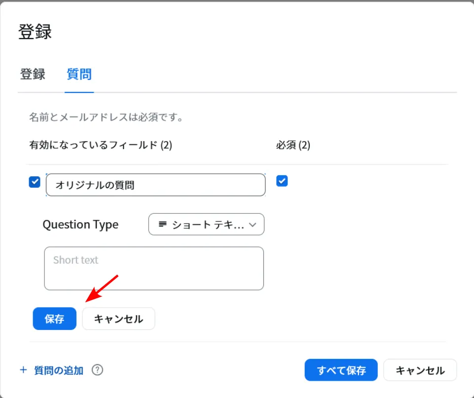- 追加したい質問への回答を必須とするためには,「必須」チェックボックスをオンにしてください.そうでないときは,「必須」チェックボックスをオフにしてください.