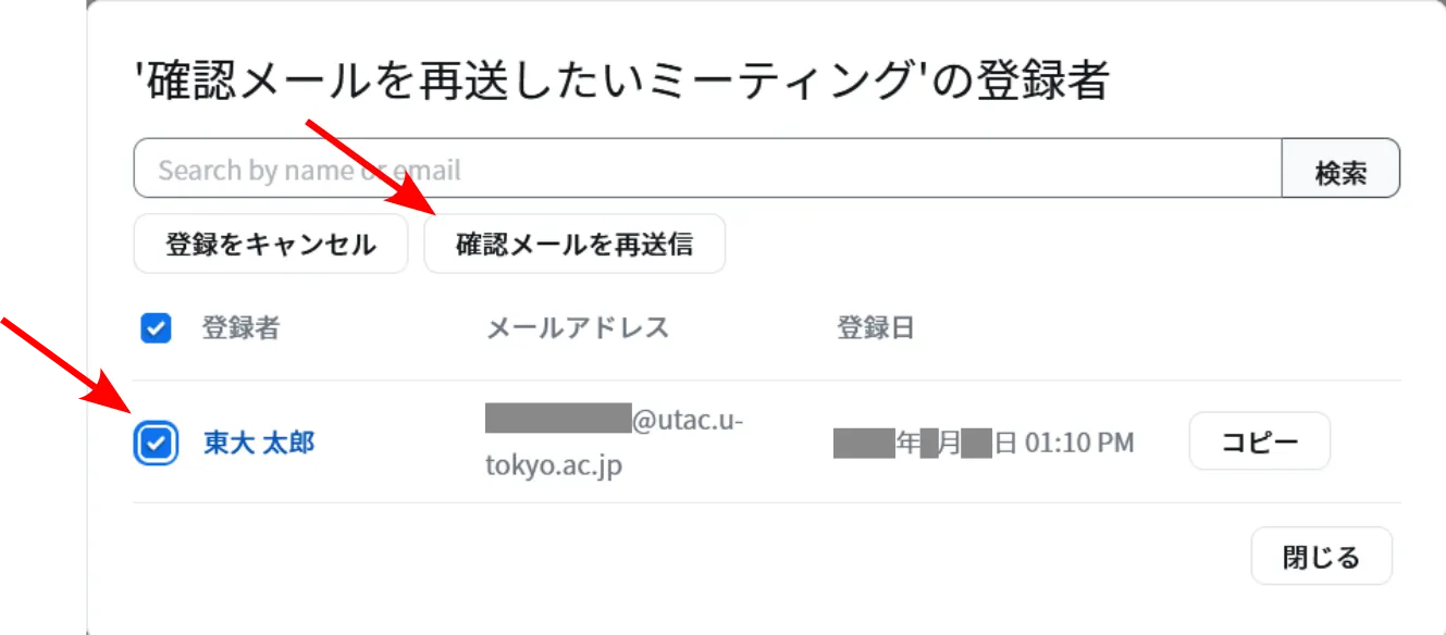 - 確認メールを再送したい登録者のチェックボックスをオンにして,「確認メールを再送信」ボタンを押してください.