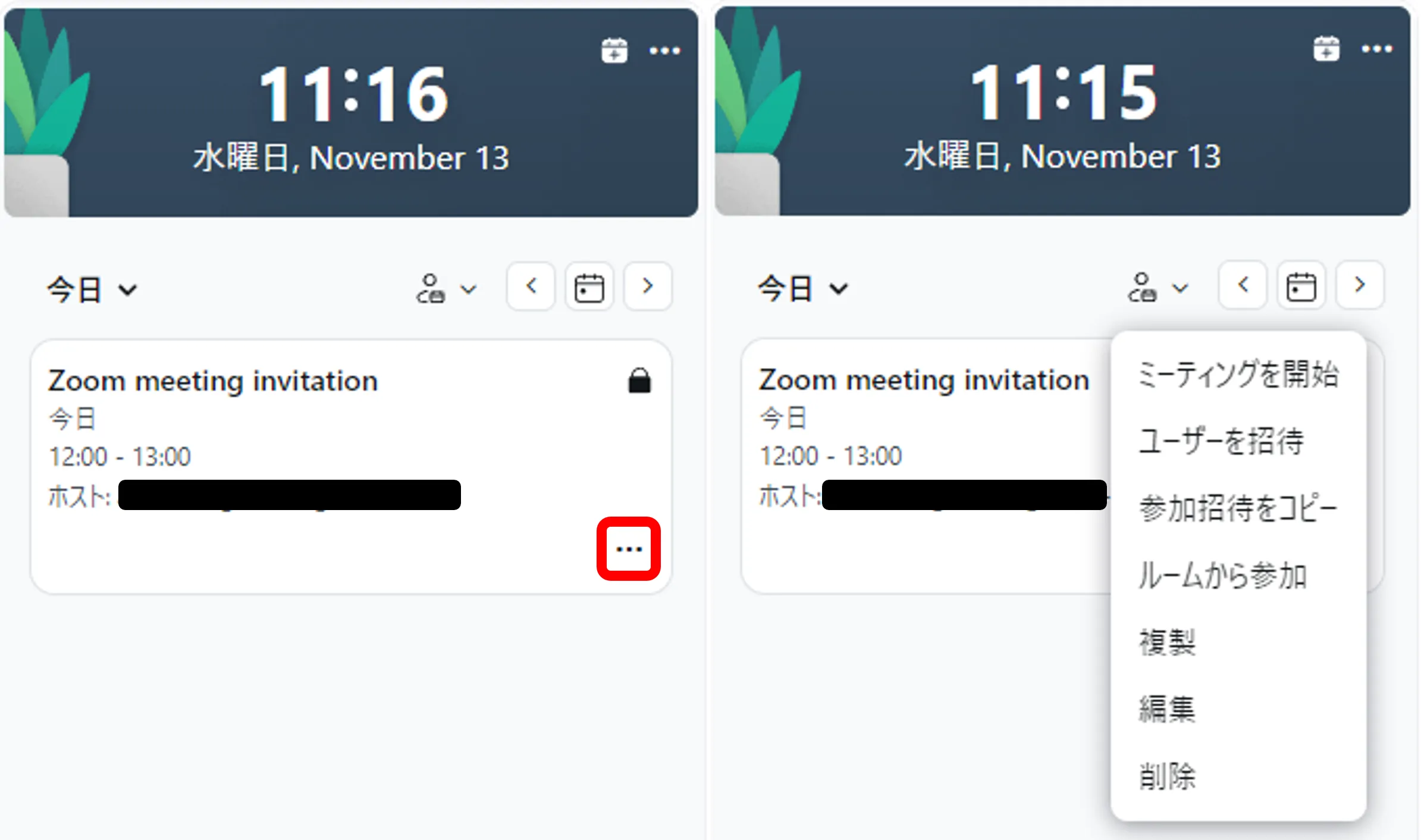 作成したミーティングはアプリ画面上部の「ミーティング」から確認でき,招待リンクのコピーやミーティングの編集が可能です. ミーティング当日には「ホーム」に下の画像のような表示が出ます.「…」から招待リンクのコピーやミーティングの編集が可能です.
