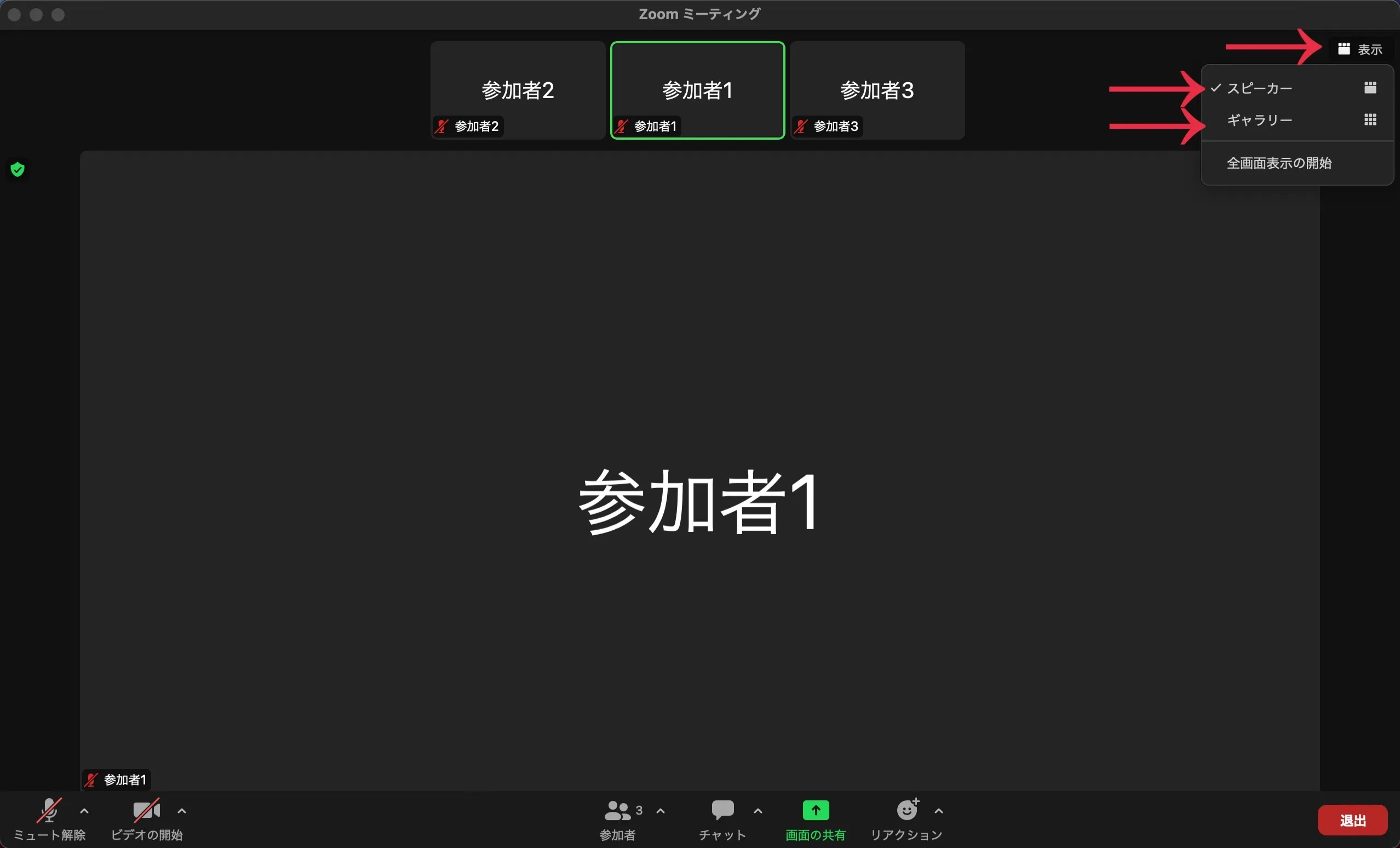 スピーカービューとギャラリービューの切り替えは,画面右上の「表示」を押した後,表示されるウィンドウで「ギャラリー」または「スピーカー」を押すことで切り替えることができます.